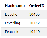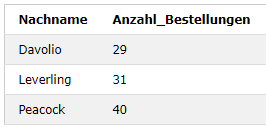 SELECT Employees.LastName AS Nachname, COUNT(Orders.OrderID) AS Anzahl_Bestellungen