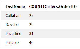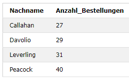 GROUP BY Employees.LastName HAVING Anzahl_Bestellungen > 27