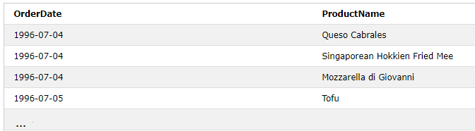 Masterfrage 3: Du möchtest dir das Bestelldatum aus der Tabelle Orders und den Produktnamen aus der Tabelle Products ausgeben lassen. Versuche die passende SQL Anfrage zu formulieren. Überprüfe, ob dein Output wie unten aussieht.