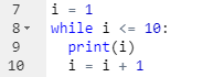 - Tippe nun deine handschriftliche Lösung zur Umwandlung der FOR- in eine WHILE-Schleife (Aufgabenteil 2 auf der vorangegangenen Folie) in den Editor ein. Klicke anschließend auf 'run'. Erhälst du dieselbe Ausgabe, wie bei der Lösung mit einer FOR-Schleife?