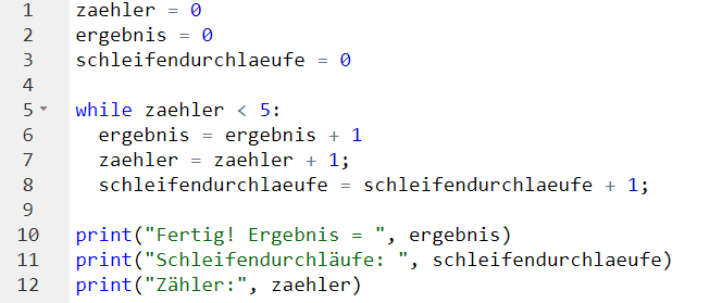Die Schleife wird fünf Mal durchlaufen und bei jedem Mal wird sowohl beim Zähler, als auch beim Ergebnis 1 zum aktuellen Wert hinzuaddiert. Nach fünf Durchläufen ist die Bedingung, dass der Zähler kleiner als 5 sein muss nicht mehr erfüllt. Die Schleife wird also automatisch nicht mehr durchlaufen und der Code weiter unten (hier zwei print-Befehle) wird ausgeführt.