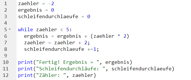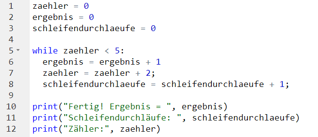 - In Zeile 2 (siehe Lösung oben) tragen wir ein, wie oft die Schleife ausgeführt wird. Das ist unsere Abbruchbedingung.
